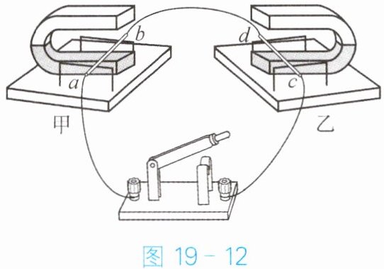 8. 如图 19 - 12 所示,甲、乙两个相同的装置分别由 U 形磁体、导体棒和支架组成,导体棒 $ ab $ 和 $ cd $ 由导线连接。闭合开关并向右移动 $ ab $,$ cd $ 也会向右移动,其中甲装置的原理是