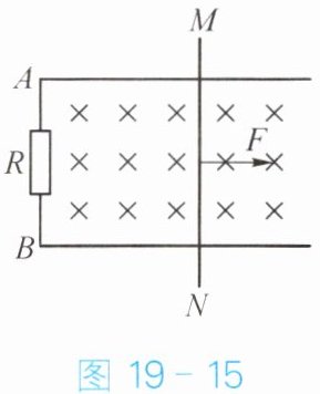 10. 人们可以用右手来判断感应电流的方向:伸开右手,使大拇指与其余四指垂直,并且都与手掌在同一平面内;让磁感线从掌心进入,并使大拇指指向导线运动的方向,这时四指所指的方向就是感应电流的方向。如图 19 - 15 所示,符号“×”表示垂直纸面向里的磁场,当导线棒 $ MN $ 在外力 $ F $ 的作用下沿导轨向右运动时,通过 $ R $ 的电流方向是(