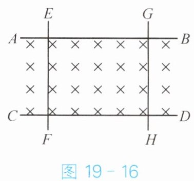 11. 如图 19 - 16 所示,$ AB $ 和 $ CD $ 是两根固定且平行的光滑金属轨道,符号“×”表示垂直纸面向里的磁场,铜棒 $ EF $ 和 $ GH $ 平行放在导轨上。当拉动铜棒 $ EF $ 向左运动时,电路中