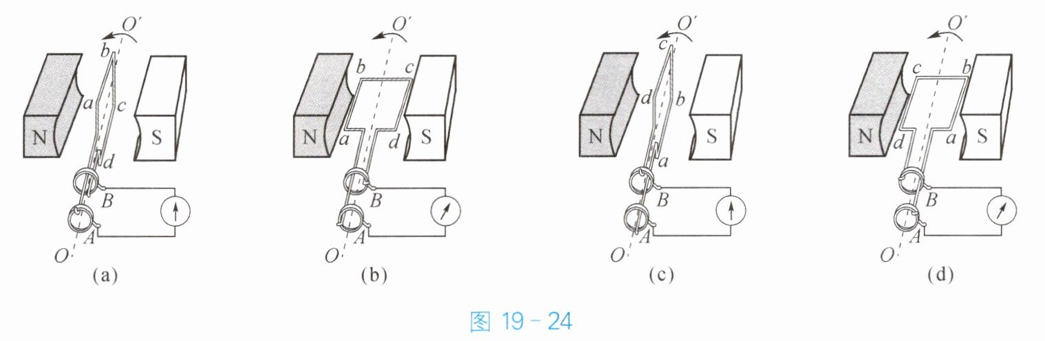 - 1. 图19-24是一台交流发电机的工作原理图。当线圈$abcd$运动到几个特殊位置时,产生感应电流的情况如下。