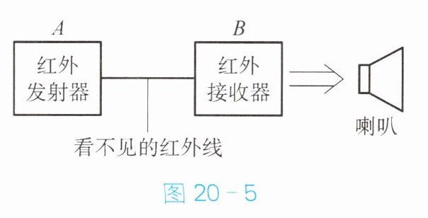 (2)图 20 - 5 为利用红外线工作的防盗报警器,其原理是红外线发射器可发出一束较强的红外线,红外线接收器可接收红外线。当盗贼遮挡在 A、B 之间,即挡住红外线时,此时红外线接收器没有接收到红外线,便驱动喇叭报警。由此可知,红外线