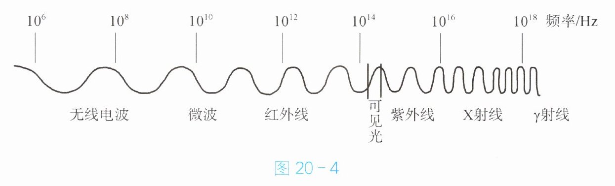 6. 图 20 - 4 是电磁波家族。智能手机与智能手环的“近场通信”所用无线电波的波段是$ 1.356×10^7 Hz。$智能手环的数据信息传递到手机利用了