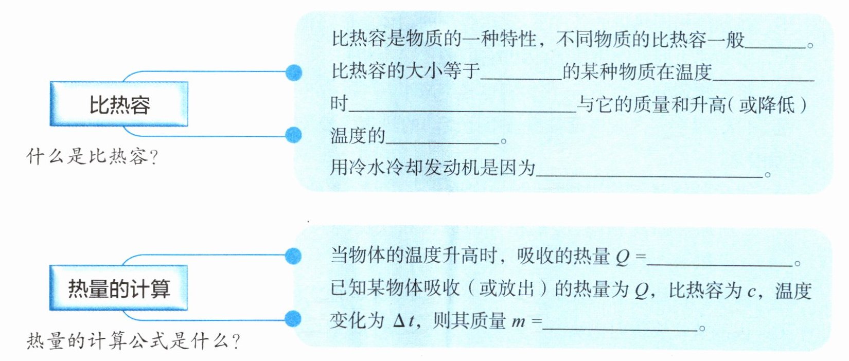 不同 一定质量 升高(或降低) 吸收(或放出)的热量 乘积之比 水的比热容较大 $cm(t_{2}-t_{1})$ $\frac{Q}{c\Delta t}$