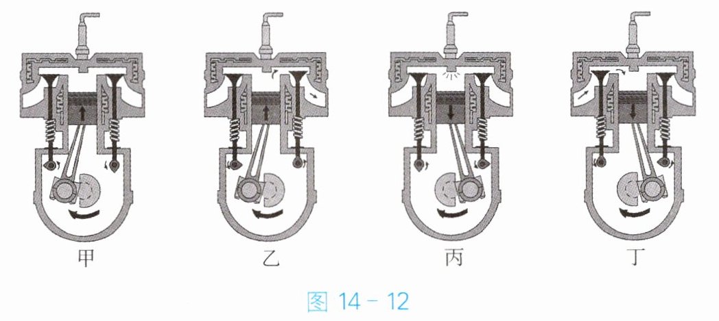 9. 图14-12为某四冲程汽油机工作时涉及的四个冲程。下列说法中正确的是(
