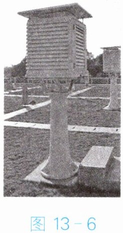 2. 走进气象站,可以看到如图 13 - 6 所示的百叶箱,箱内主要的测量仪器有:两支湿度计(绝对湿度计和相对湿度计)和两支温度计(测量并记录一天中最高气温的温度计和最低气温的温度计)。