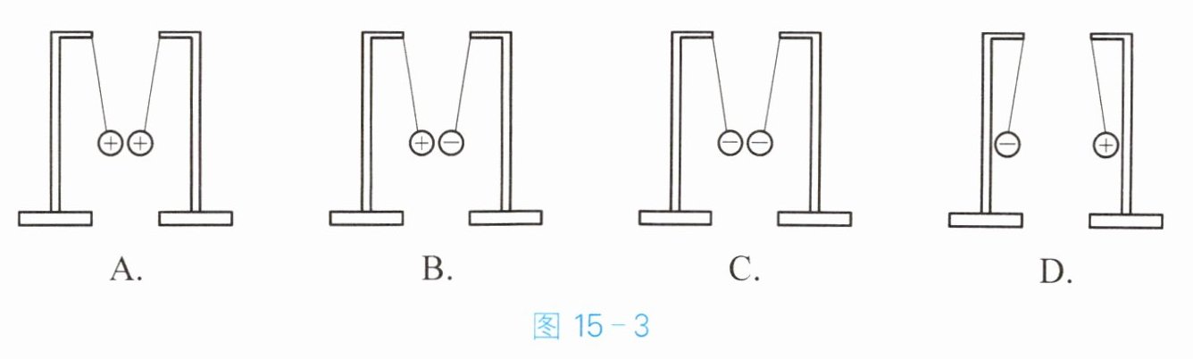 3. 如图 15 - 3 所示,将带电轻质小球用绝缘细线悬挂在铁架台上,使两个小球相互靠近。它们之间的相互作用情况正确的是(