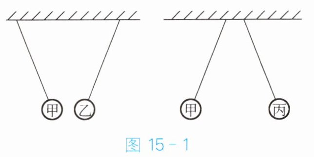 例题 甲、乙、丙三个带电轻质小球用绝缘细线悬挂在天花板上,它们之间相互作用时的场景如图 15 - 1 所示,已知甲球与用毛皮摩擦过的橡胶棒相互吸引。下列判断中正确的是(