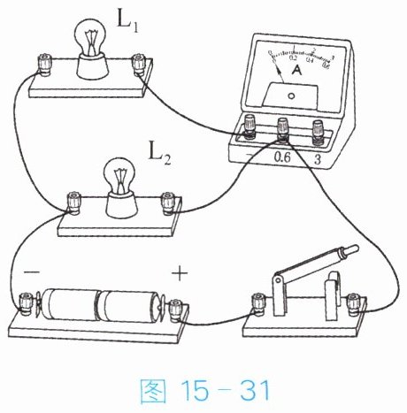 例题 图 15 - 31 所示的电路中,灯 $ L_1 $、$ L_2 $ 是______联的,电流表测灯______的电流。