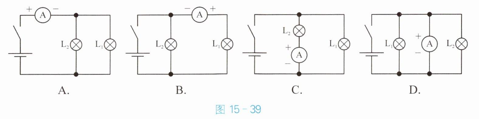 6. 图 15 - 39 的四个电路中,要实现用电流表测量通过灯泡 $ L_2 $ 中的电流,其中正确的接法是(