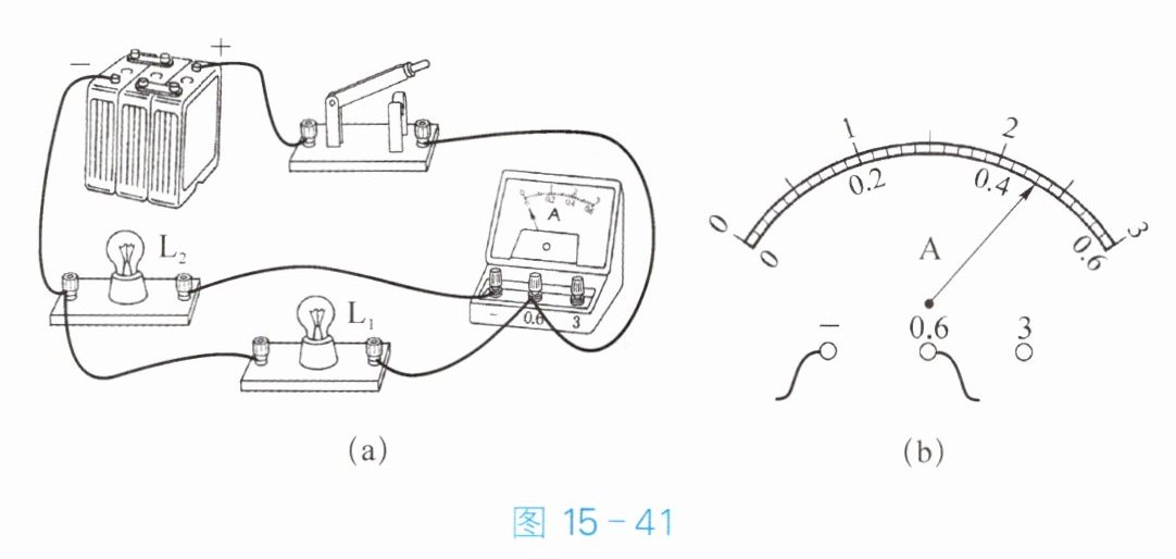 的电流。闭合开关后,若电流表的示数如图 15 - 41(b) 所示,则通过该灯的电流是0.46