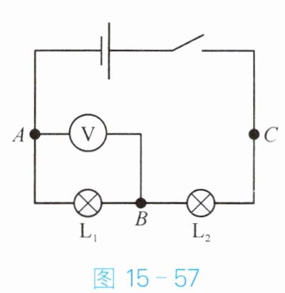 2. 小明在“用电压表测量电压”实验中,设计的电路图如图15-57所示。他先用电压表正确地测量了灯泡$L_1$两端的电压,为了测量灯泡$L_2$两端的电压,他想将电压表接A处的那一段导线改接到电路中的C处,且保持电压表接B处不动。你认为这种接法是