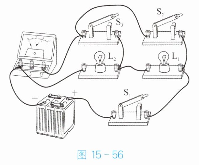 1. 如图15-56所示,闭合$S_1、$$S_2,$断开$S_3,$电压表测量