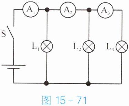 7. 如图15-71所示,开关S闭合后,电流表$A_1、$$A_2、$$A_3$的示数分别是$I_1、$$I_2、$$I_3。$下列关系式中正确的是(