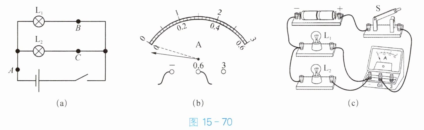 。在排除故障后,小明连接的电路如图15-70(c)所示,则开关闭合后,电流表测量的是图15-70(a)中A