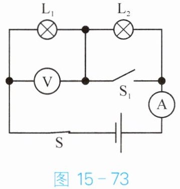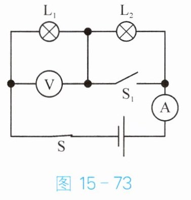 9. 如图15-73所示,电路中电源电压保持不变,开关S始终闭合。当开关$S_1$闭合时,灯$L_2$被