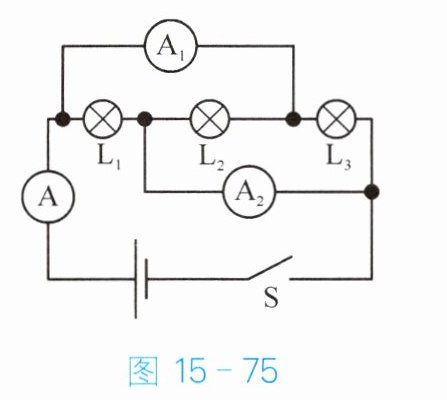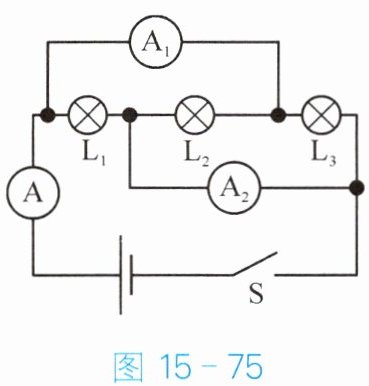 2. 如图15-75所示,已知电流表A的示数为1.5 A,电流表$A_1$的示数为0.8 A,电流表$A_2$的示数为1.2 A。通过$L_1、$$L_2、$$L_3$的电流分别为