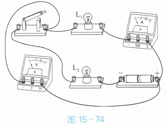 1. 小明按照图15-74中的电路操作来研究串联电路中电流、电压的特点。当开关闭合时,灯$L_1$亮,灯$L_2$不亮,电流表和电压表均有示数。故障原因可能是(