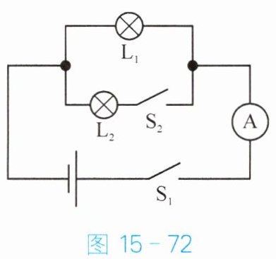 8. 如图15-72所示,电路中电源电压不变,闭合开关$S_1、$$S_2,$两灯都发光。当开关$S_2$断开时$,L_1$的亮度及电流表的示数变化情况是(