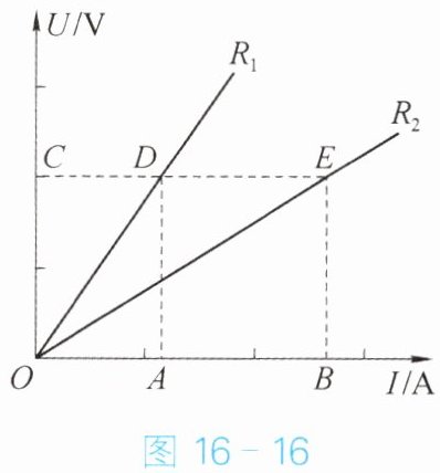 分析 如图 16 - 16 所示,沿$ CE $横线看,电压一定,$ R_1 $对应的电流小,$ R_2 $对应的电流大,因此$ R_2 $的电阻小。沿$ AD $竖线看,电流一定,$ R_1 $对应的电压大,$ R_2 $对应的电压小,因此$ R_2 $的电阻小。