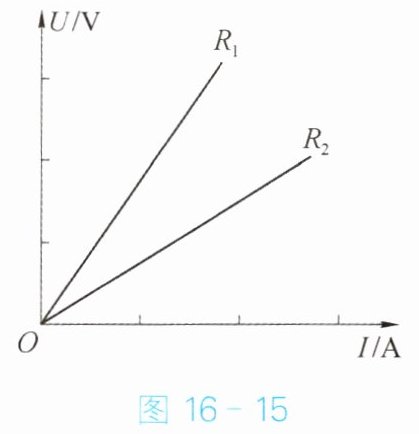 在探究电流与电压关系的实验中,分别用$ R_1 $、$ R_2 $两个电阻进行探究,并根据各自的实验数据绘制了如图 16 - 15 所示的$ U - I $图像。从图中可以看出$ R_1 与 R_2 $的大小关系是(