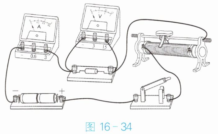 3. 某同学在“伏安法测电阻”实验中,将实物连成如图 16 - 34 所示的电路。已知每节干电池的电压为 $ 1.5 \, V $,估计被测电阻约为 $ 10 \, \Omega $。根据题中信息,仔细观察电路,写出其中连接的不当之处:(1)