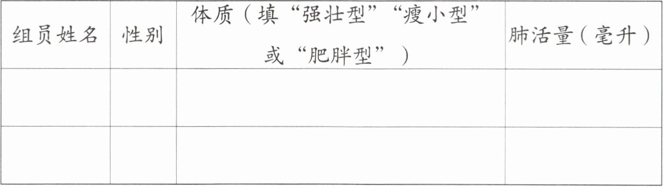 | 组员姓名 | 性别 | 体质(填“强壮型”“瘦小型”或“肥胖型”) | 肺活量(毫升) |