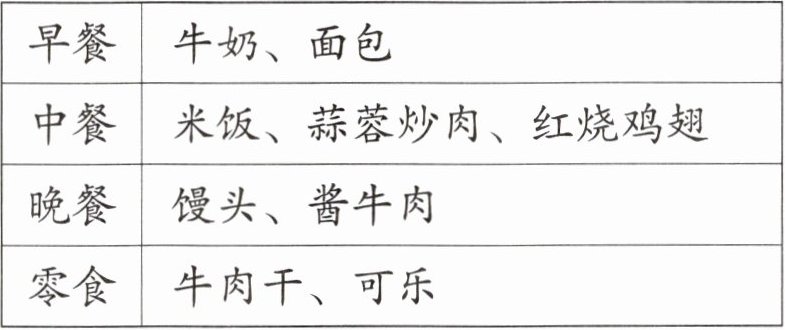 三、下表是四(1)班一位同学一天中所吃食物的记录表,请根据表格回答下列问题。