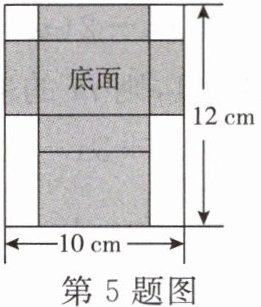 5. 如图是一张长为 12 cm、宽为 10 cm 的矩形铁皮,将其剪去两个全等的正方形和两个全等的矩形,剩余部分(阴影部分)可制成底面积为$ 24 cm^2 $的有盖的长方体铁盒,则剪去的正方形的边长为