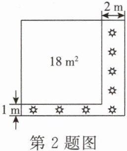 2. 公园有一块正方形的空地,后来从这块空地上划出部分区域栽种鲜花(如图),原空地一边减少了 1 m,另一边减少了 2 m,剩余空地的面积为$ 18 m^2,$求原正方形空地的边长.设原正方形空地的边长为 x m,则可列方程为 (