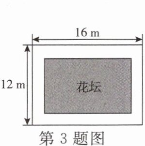 3. 如图,某小区要在长为 16 m、宽为 12 m 的矩形空地上建造一个花坛,使花坛四周小路的宽度相等,且花坛所占面积为空地面积的一半,则小路的宽为