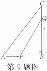 9. 如图,在△ABC 中,∠B= 90°,AB= 5 cm,BC= 7 cm,点 P 从点 A 开始沿边 AB 向点 B 以 1 cm/s 的速度移动,点 Q 从点 B 开始沿边 BC 向点 C 以 2 cm/s 的速度移动,点 P,Q 分别从点 A,B 同时出发.