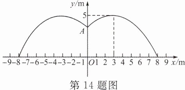 14. 某公园有一个直径为 16 m 的圆形喷水池,喷出的水柱为抛物线形,且各方向喷出的水柱恰好落在水池内,过喷水管口所在铅垂线 OA 的每一个截面均可得到两条关于 OA 对称的抛物线,如图所示,以喷水池中心 O 为原点,喷水管口所在铅垂线为 y 轴,建立平面直角坐标系.