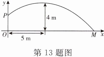 13. 如图,壮壮同学投掷实心球,出手(点 P 处)的高度 OP 是$\frac{7}{4}$m,出手后实心球沿一段抛物线运行,到达最高点时,水平距离是 5 m,高度是 4 m,实心球落地点为 M.