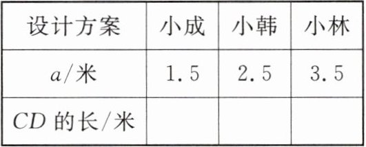 ②小成、小韩和小林根据$a$的长度分别给出了3种不同的设计方案,请补全表格,并判断谁的方案较为合理;