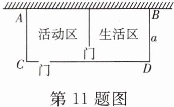 11. [应用意识]为了给学校的小鸭提供舒适的环境,饲养小组决定用长为$k$米的篱笆和一面长为6米的墙围成如图所示的矩形鸭圈(不超出墙).整个鸭圈的正中间被篱笆隔断成活动区和生活区,活动区和两区中间的篱笆上分别开了一道门,两道门的宽均为0.5米,鸭圈垂直于墙的一边的长为$a$米(篱笆全部用完,门的材料另备).