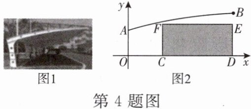 4. 如图1为一汽车停车棚,其棚顶的横截面可以看作是抛物线的一部分,如图2是棚顶的竖直高度y(单位:m)与距离停车棚支柱AO的水平距离x(单位:m)近似满足函数关系$y= -0.02x^{2}+0.3x+1.6$的图象,点B(6,2.68)在图象上.若一辆厢式货车需在停车棚下避雨,货车截面可看作长CD= 4 m,高DE= 1.8 m的矩形,则可判断货车______完全停到车棚内(填“能”或“不能”).