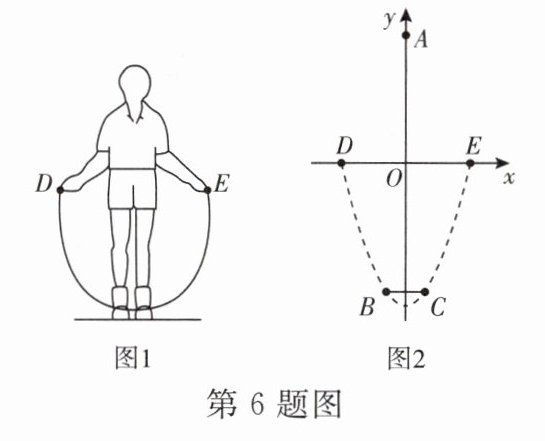 6. 跳绳是一项很受欢迎的健身活动,如图1是小明跳绳运动时的示意图,以DE的中点O为原点建立如图2所示的平面直角坐标系.甩绳近似抛物线形状,脚底B,C相距20 cm,头顶A离脚底175 cm,相距60 cm的双手D,E离脚底BC所在直线均为80 cm.点A,B,C,D,E在同一平面内.小明调节绳子,使跳动时绳子刚好经过脚底B,C两点,且甩绳形状始终保持不变.