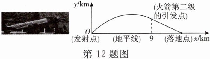 12. 16 世纪中叶,我国发明了一种新式火箭“火龙出水”,它是二级火箭的始祖. 火箭第一级运行路径形如抛物线,当火箭运行一定水平距离时,自动引发火箭第二级,火箭第二级沿直线运行. 某科技小组运用信息技术模拟火箭运行过程. 如图,以发射点为原点,地平线为 $ x $ 轴,垂直于地面的直线为 $ y $ 轴,建立平面直角坐标系,分别得到抛物线 $ y= ax^{2}+x $ 和直线 $ y= -\frac{1}{2}x+b $. 其中,当火箭运行的水平距离为 9 km 时,自动引发火箭的第二级.