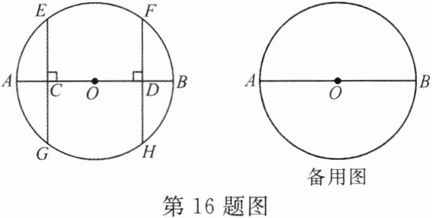 16. 如图,在$\odot O$中,$C$,$D是直径AB$上的两点,$EG\perp AB$,$FH\perp AB$,分别交$AB于点C$,$D$,点$E$,$G$,$F$,$H在\odot O$上.
