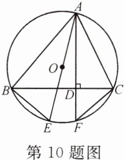 10. 如图,AB,AC 是$\odot O$的弦,$AD\perp BC$于点 D,交$\odot O$于点 F,AE 是$\odot O$的直径,试判断弦 BE 与弦 CF 的大小关系,并说明理由.