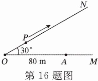 16. [应用意识]如图,有两条公路 OM,ON 相交成$30^\circ$角,沿公路 OM 方向离 O 点 80 m 处有一所学校 A,当重型运输卡车 P 沿道路 ON 方向行驶时,在以点 P 为圆心,50 m 长为半径的圆形区域内都会受到卡车噪声的影响,且与卡车距离越近,噪声影响越大. 已知重型运输卡车 P 沿道路 ON 方向行驶的速度为 18 km/h.