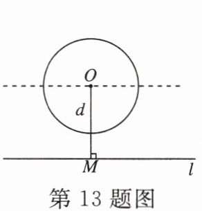 13. 如图,给定一个半径为 2 的圆,圆心 O 到水平直线 l 的距离为 d,即 OM = d. 我们把圆上到直线 l 的距离等于 1 的点的个数记为 m. 如 d = 0 时,l 为经过圆心 O 的一条直线,此时圆上有四个到直线 l 的距离等于 1 的点,即 m = 4,由此可知:
