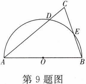9. 如图,在等腰三角形ABC中,AB= AC= 10,∠C= 70°,以AB为直径作半圆,与AC,BC分别相交于点D,E,则$\widehat{DE}$的长为