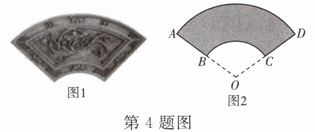 4. 甘肃临夏砖雕是一种历史悠久的古建筑装饰艺术,是第一批国家级非物质文化遗产. 如图1是一块扇面形的临夏砖雕作品,它的部分设计图如图2,其中扇形OBC和扇形OAD有相同的圆心O,且圆心角∠O= 100°,若OA= 120 cm,OB= 60 cm,则阴影部分的面积为(