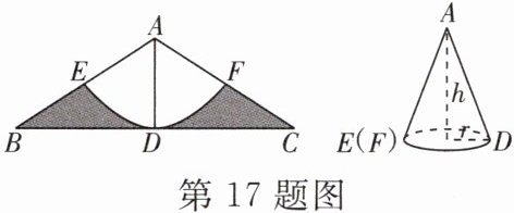17. [空间观念]如图,在等腰三角形 ABC 中,∠BAC= 120°,∠BAC 的平分线交 BC 于点 D,AD= 6,以点 A 为圆心,AD 长为半径画$\widehat{EF}$,交 AB 于点 E,交 AC 于点 F.