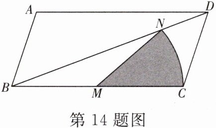 14. 如图是一张平行四边形纸片 ABCD,BC= 36 cm,∠A= 110°,∠BDC= 50°,M 为 BC 的中点,若以点 M 为圆心,MC 长为半径画弧,交对角线 BD 于点 N,则∠NMC= ______°;将扇形 MCN 纸片剪下来围成一个无底盖的圆锥(接缝处忽略不计),则这个圆锥的底面圆半径为______ cm.