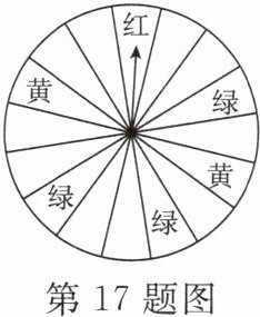 17. 如图,端午节期间,某商场为了吸引顾客,设立了一个可以自由转动的转盘(转盘被平均分成 16 份),并规定:顾客每购买 100 元的商品,就能获得一次转转盘的机会,如果转盘停止后,指针正好对准红色、黄色或绿色区域,顾客就可以分别获得玩具熊、童话书、水彩笔. 小明和妈妈购买了 125 元的商品,请你分析计算: