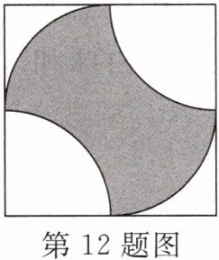 12. 如图,在正方形中,阴影部分是以正方形的顶点及其对称中心为圆心,以正方形边长的一半为半径作弧形成的封闭图形. 将一个小球在该正方形内自由滚动,小球随机地停在正方形内的某一点上. 若小球停在阴影部分的概率为$P_1$,停在空白部分的概率为$P_2$,则$P_1与P_2$的大小关系为 (