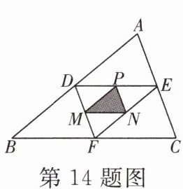 14. 如图,在△ABC 中,D,E,F 分别是 AB,AC,BC 的中点,P,M,N 分别是 DE,DF,EF 的中点. 若随机向△ABC 内投一粒米,则米粒落在图中阴影部分的概率是