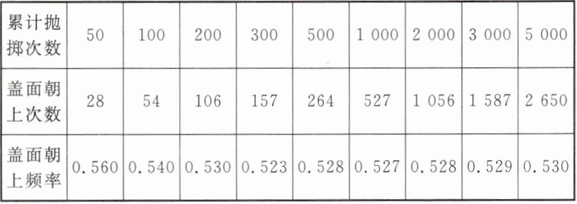 根据以上实验数据,可以估计出“盖面朝上”的概率约为